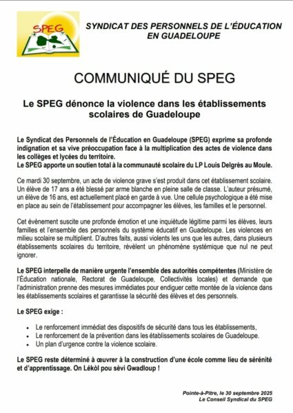 Le SPEG dénonce la spirale de la violence dans les établissements scolaires de Guadeloupe !